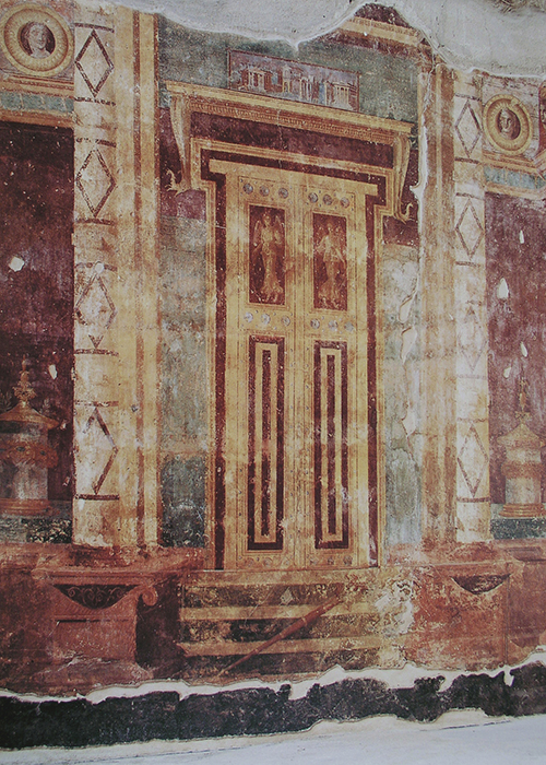 Villa di Poppea, Oplontis, détail montrant une des quatre portes en ivoire et en écailles de tortue, située sur des murs opposés dans l’atrium. La vignette au-dessus de cette porte représente une rue de tombeaux, indiquant donc qu’il ne s’agit pas de la représentation d’une porte de palais, mais d’une porte menant à l’Élysée.