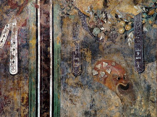 1. Peinture murale de Premier style représentant un masque et des guirlandes de fruit suspendues (Cornucopia), drapées avec des écharpes de la cérémonie de fiançailles, Musée archéologique de Palerme, Sicile.
