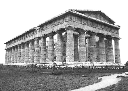 La plupart du matériel visuel utilisé pour soutenir la thèse du livre est déterminé par le « concept » de la villa, plutôt que par son existence dans la réalité. Les origines de la villa romaine, dit-on, sont compliquées et ont à peine été étudiées (p. 136). Cependant, malgré ce manque de recherche, son origine, mise en évidence tout au long du livre, est celle d’une villa hellénistique palatiale détenue par des monarques et des potentats, avec lesquels les Romains ont été en contact direct à la suite de leurs politiques d’expansion. La localisation de Néapolis et de Pompéi en Magna Graecia, au sud de l’Italie, et donc une région faisant essentiellement partie de la Grèce pendant plus de cinq cents ans avant la conquête romaine, est minimisée en faveur de l’« étranger » et donc de « l’autre », encore plus exotique (fig. 1). Les temples grecs de Paestum, situés non loin de Pompéi, au sud, illustrent que trop parfaitement ce point précis (fig. 2)