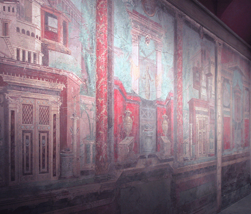 Mais pour quelle raison cette pièce précise a-t-elle poussé Zanker à la critiquer en recourant à un langage aussi provocateur ? Dans le paragraphe juste avant ses commentaires sur le nymphaeum, nous pouvons lire que les propriétaires de telles pièces s’intéressaient uniquement à la possession de peintures de grandes dimensions qui permettaient de projeter leurs fantasmes hédonistes. Un ensemble de peintures agencées spatialement de façon logique, dans des endroits cohérents, ne les intéressait apparemment pas, car le déploiement ostentatoire était leur seul objectif. Les preuves avancées pour soutenir ces observations résident en l’absence d’encadrement autour des peintures. Il affirme qu’un cadre aurait permis d’insérer les peintures dans l’espace architectural où elles se situent, rendant ainsi l’agencement plus logique et cohérent. Cette critique est assez surprenante dans le sens où les propriétaires de ces pièces voulaient les transformer en des univers fantastiques luxueux et ostentatoires, cibles des accusations continues de l’auteur. Le retrait des cadres qui ancraient les peintures dans le monde réel aurait alors constitué une partie essentielle de la stratégie. Les peintures en trompe-l’œil de grandes dimensions visent précisément ce but, car elles créent une passerelle harmonieuse entre les réalités réelles et virtuelles, attirant ainsi le spectateur dans un monde de leur confection (fig. 2).
