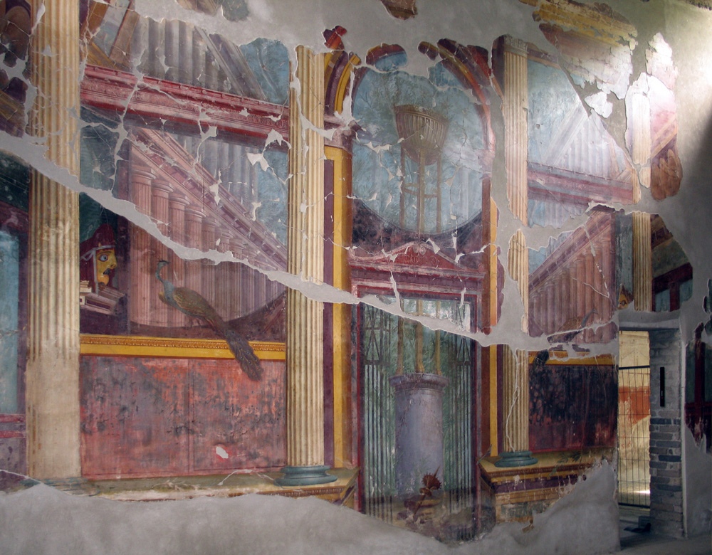 Peinture murale représentant une entrée d’un sanctuaire temenos dédié à Apollon et aux ancêtres, Villa di Poppea, Oplontis, situé entre Pompéi et Herculanum.